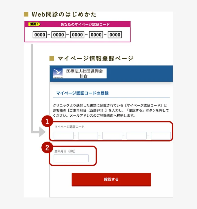 マイページ情報登録ページにアクセスしたら、『Web問診のはじめかた』に記載されている「あなたのマイページ認証コード」をご入力ください。