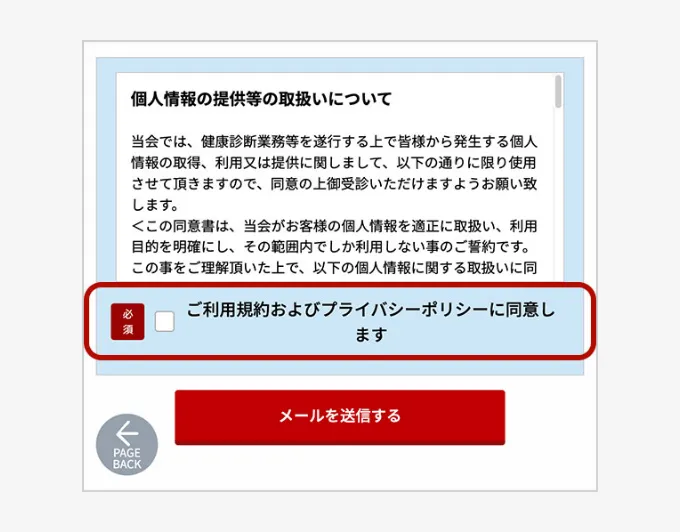 ご入力後、画面下に進み「個人情報等に関する規約」をご一読の上「メールを送信する」ボタンをクリックしてください。