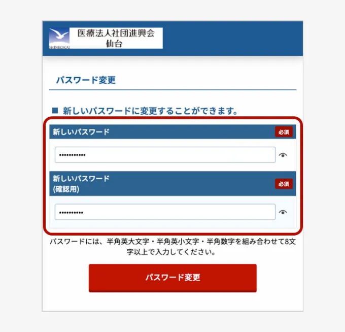 パスワードは半角英数文字を使用し、大文字・小文字、数字を組み合わせて作成してください。