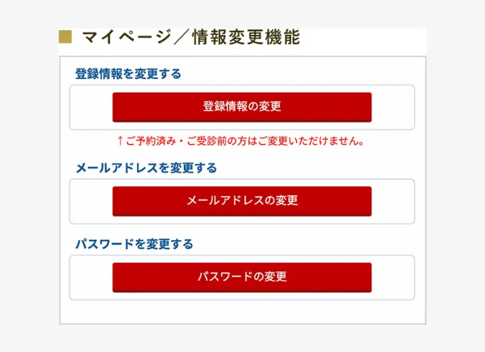マイページを下方向に進んでいくと、各種情報の変更を行うボタンがあります。